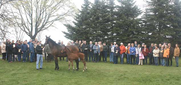 Treffpunkt war die Deckstelle in Grethem, wo schon einige besonders gelungene Jungtiere zu bestaunen waren. Anschließend ging es auf der von Deckstellenvorsteher Heiko Feldhus ausgearbeiteten Route über Büchten und Eilte in Privatwagen nach Lichtenhorst zu Wilhelm Heyer. Von dort war es dann nicht mehr weit zum Zwischenstopp bei Kaffee und Kuchen auf dem Hof von Friedrich Langrehr in Rodewald, wo es so züchterische Kostbarkeiten wie ein Rappstutfohlen von Hohenstein/Donnerhall/Rubinstein/Weltmeyer zu sehen gab.